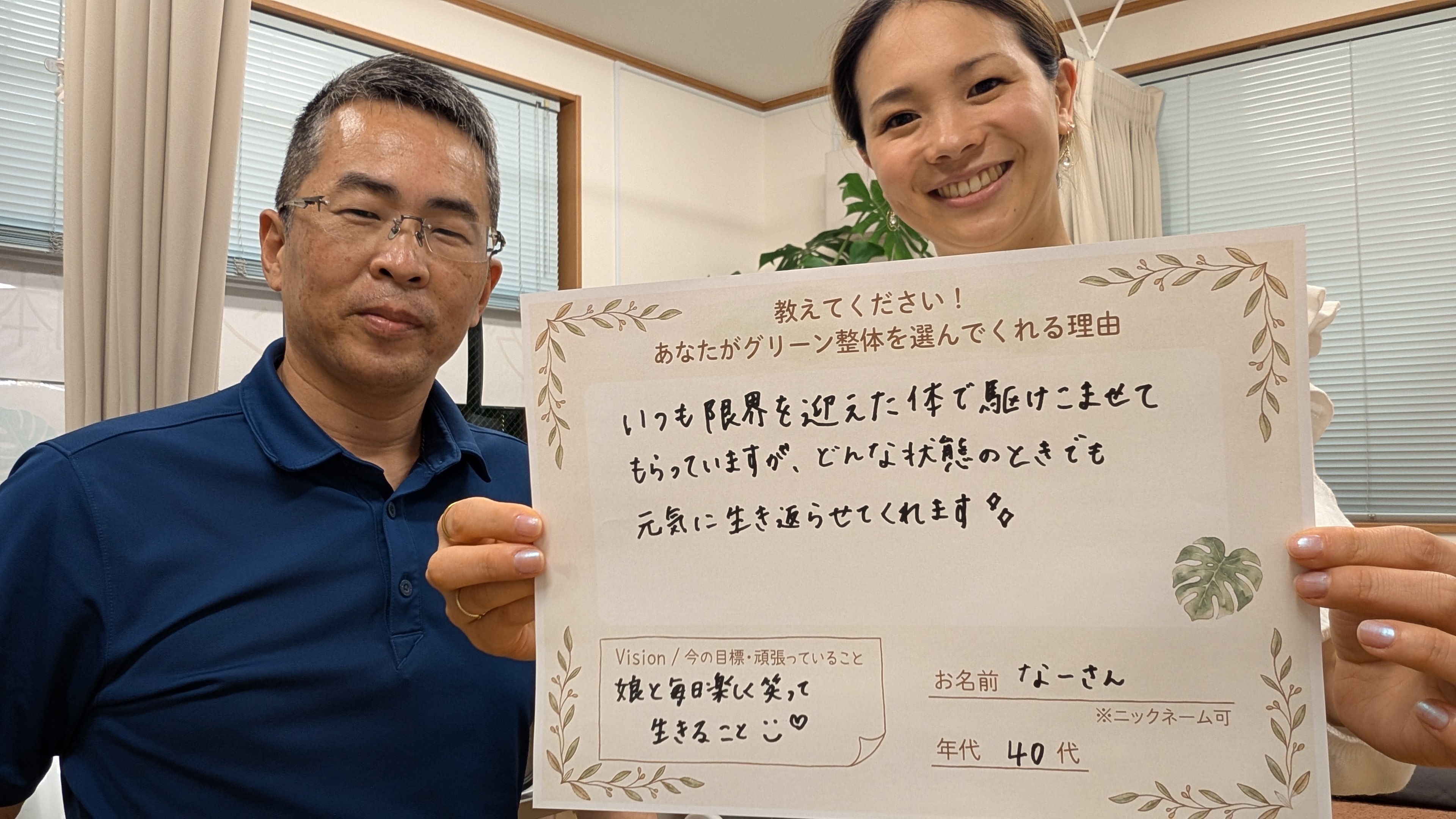 ご来店時は「全身お疲れモード」だったのが、 施術後には「気持ちよかった!」と満面の笑顔を見せてくれる。 その瞬間が、私にとっても一番の喜びです。